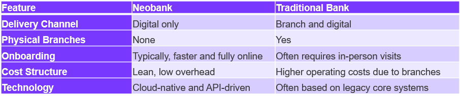 The primary distinction between a neobank and a traditional bank is the delivery model. Neobanks are digital-native and operate without physical locations, while traditional banks have branch networks and legacy systems.