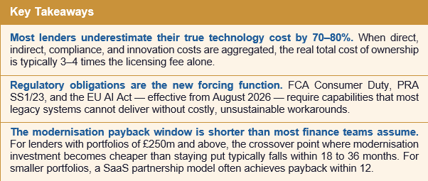 What is not a viable option — given FCA Consumer Duty, PRA SS1/23, and the EU AI Act on the immediate horizon — is sustained inaction. The regulatory frameworks that are arriving do not accommodate systems that cannot produce an audit trail, explain a decision, or demonstrate model governance. The cost of legacy is no longer merely commercial. It is becoming a compliance liability.