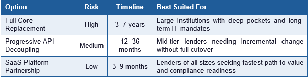 - Institutional Risk Aversion is understandable but ultimately counterproductive. The memory of failed large-scale core banking migrations — often cited are projects that ran years over schedule and hundreds of millions over budget — creates a cultural bias toward inaction. But this framing ignores two important shifts: the maturity of modern SaaS lending platforms with proven migration methodologies, and the growing cost of the status quo as regulatory requirements become more demanding.